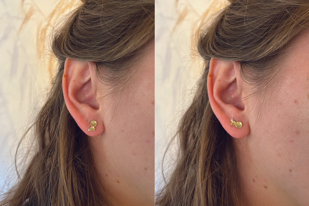 The ear climber studs can be worn in various ways, depending on your preference. For example, as ear climbers that lie against the ear and stretch along the earlobe. But they can also be worn like classic ear studs, pointing down lengthwise. Both variations can be seen in the pictures with model.