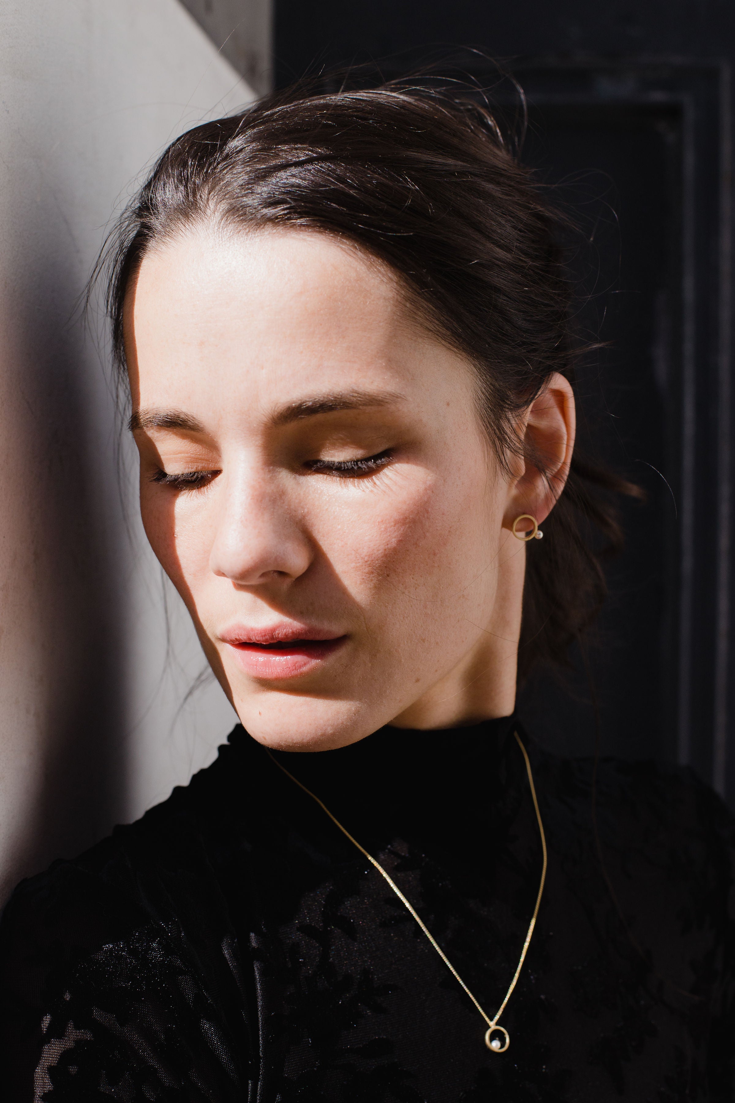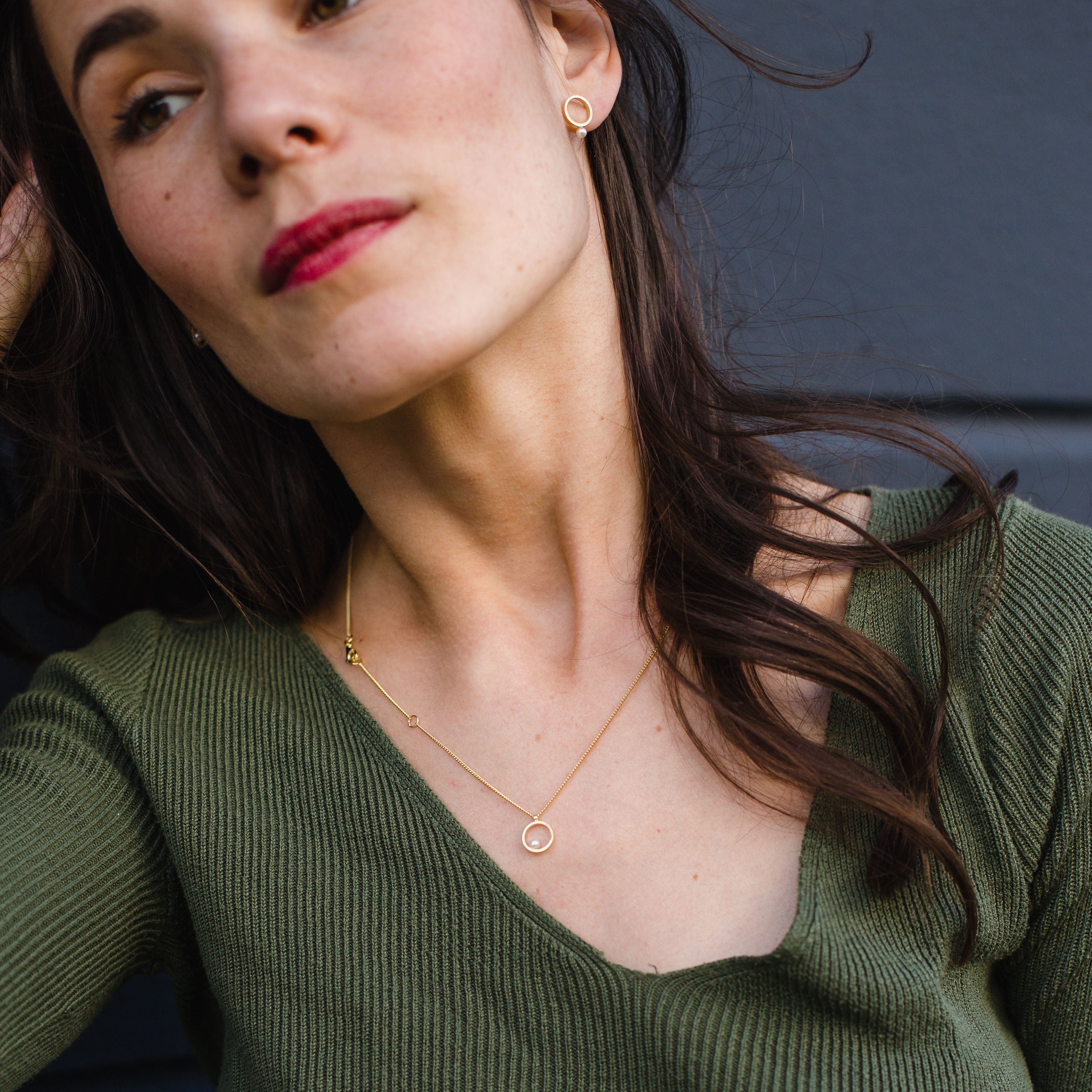 This collection combines minimal, geometric shapes with freshwater pearls. On the side of the golden ring is a white reflecting the light. This creates the visual effect of a subtle movement, the pearl appears to be gravitating around the ring. The surface of the ring is matt outside and polished on the inside. The shiny inner side differs from the rest of the matt gold color, creating a vivid contrast in the design of the precious metal. The necklace is a playful interpretation of traditional pearl jewellery and is light, minimal and wearable.
